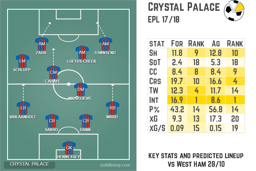 Manuel Lanzini is the only West Ham player that stands out as being cash game viable on either site ($6100 DK, £15 YH). Lanzini took set pieces and had 5 shots and 11 crosses in the loss to Brighton last week. He isn’t a priority play on this slate at that price; keep in mind that he’s similar to Cabaye for DFS purposes but is significantly more expensive despite being away from home. Palace also currently rank 4th best in crosses against per game, possibly because they have been so bad through the middle of the pitch that teams haven’t needed to spread the ball out wide as often…