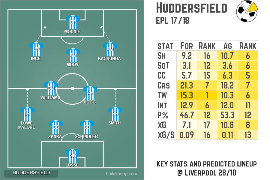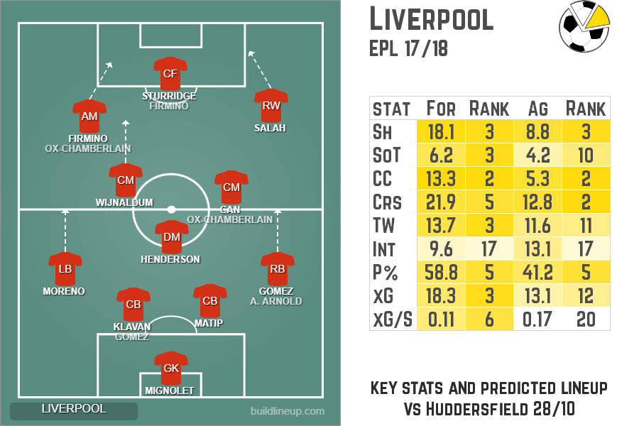 Liverpool currently rank 3rd best in shots against per game, but 20th in xG/Sh against. When teams have chances, they are finding the back of the net. Set pieces have been especially problematic (nothing new for Klopp), with 3.5 xG against and 0.25 xG/Sh against from corners, which is worst in the league. Liverpool are also pressing less than last season, perhaps due to the absence of Lallana and the need to conserve fitness levels for the Champions League. The good news for Liverpool is that Huddersfield have been poor at creating good quality chances – they are only shooting 9.2 times per game and just under half of those attempts are from outside the box, leading to low rankings in xG and xG/Sh.