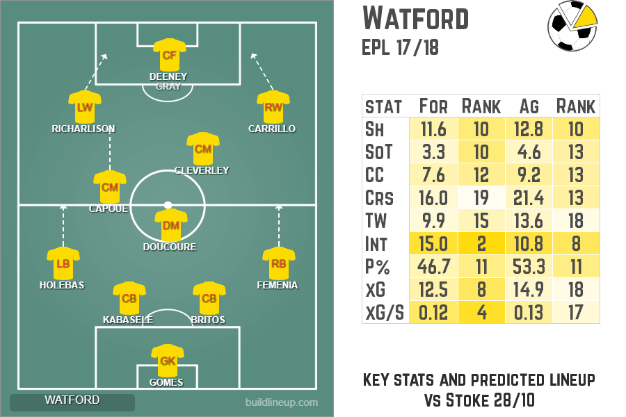 Jose Holebas is the most cash game viable Watford player, with cross totals of 11, 9 and 12 in the last 3 games thanks to his role as the main set piece taker. Two of those games were against Arsenal and Chelsea, and he should be able to fire in plenty more crosses against Stoke this weekend. He’s expensive on DraftKings but is much more appealing there regardless. He’ll need a clean sheet or an assist to really be worth using on Yahoo.
